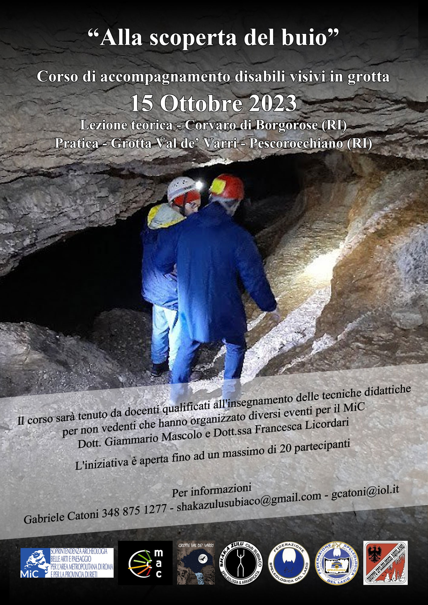 La Soprintendenza Archeologia, Belle Arti e Paesaggio per l’area metropolitana di Roma e per la provincia di Rieti, in collaborazione con il Museo Archeologico del Cicolano, le Grotte Val de’ Varri, la Federazione Speleologica del Lazio e lo Shaka Zulu Club di Subiaco presenta “Alla Scoperta del Buio: corso di accompagnamento disabili visivi in grotta” destinato a speleologi, archeologi, operatori culturali e guide turistiche.