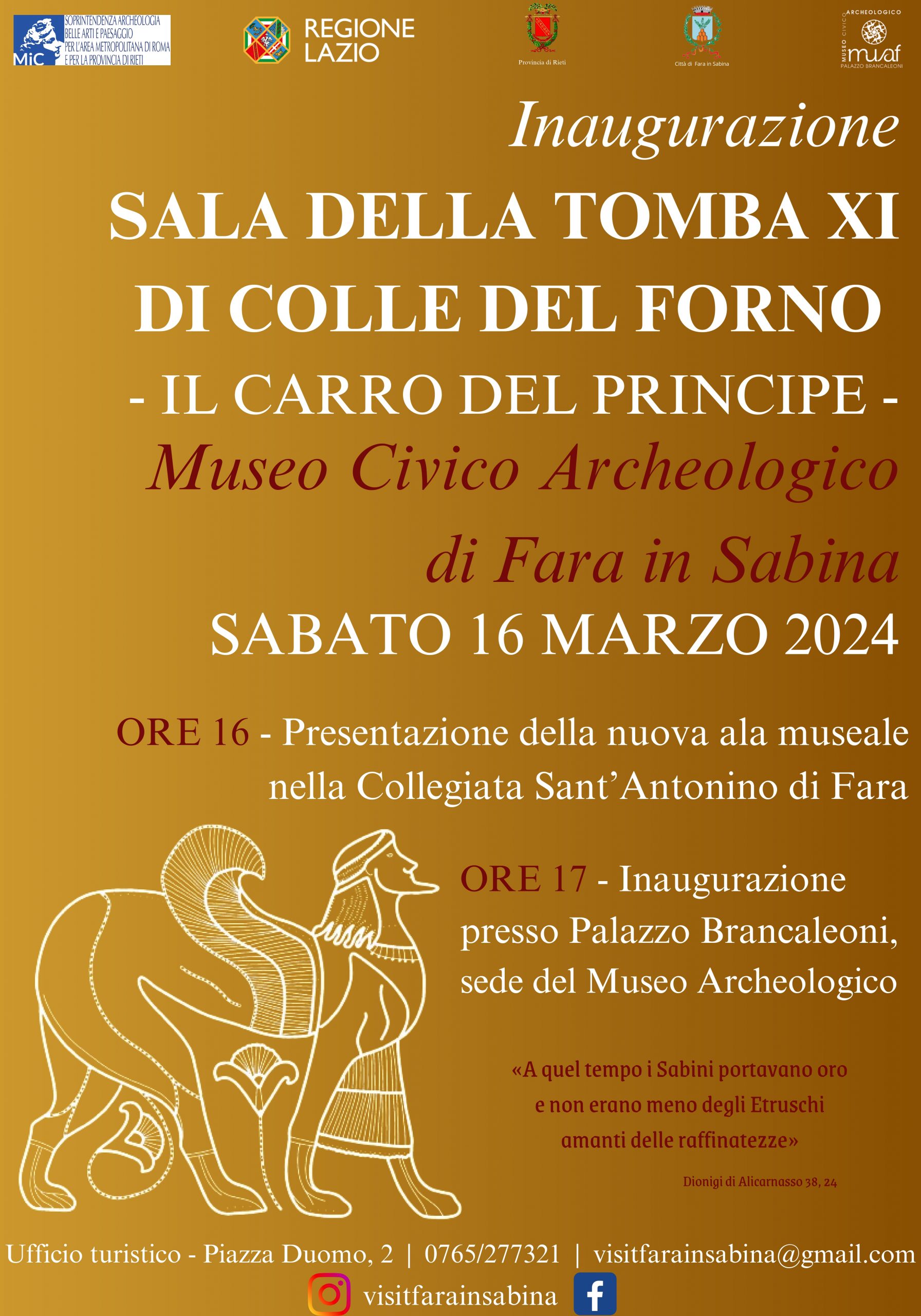 Il Museo Civico Archeologico di Fara in Sabina si prepara ad aprire le sue porte, sabato 16 marzo, al corredo funerario della Tomba XI della Necropoli di Colle del Forno e al suo reperto più celebre: il Carro del Principe di Eretum (nel territorio Montelibretti). Dopo un anno di lavori di ristrutturazione e di allestimento degli spazi museali di Palazzo Brancaleoni, verranno inaugurate le nuove sale dedicate all’esposizione dei preziosi materiali del VII sec. a.C., che qui troveranno una permanente collocazione.
